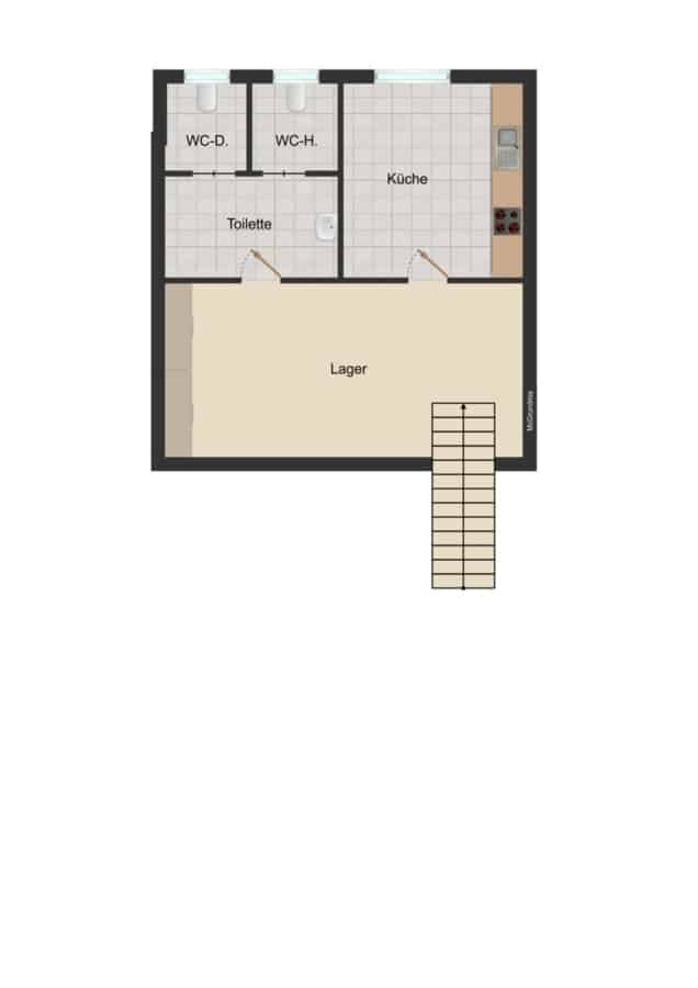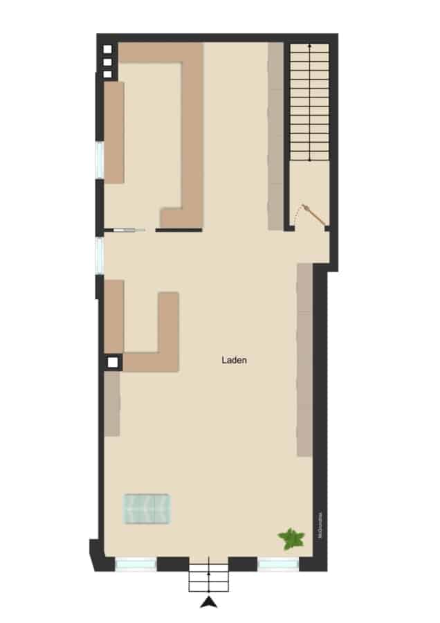 Der großzügige Gastraum im Erdgeschoss bietet vielfältige Möglichkeiten für eine ansprechende Cafégestaltung und eine angenehme Atmosphäre für Gäste. Die zusätzliche Kellerfläche eignet sich ideal als Lager-, Kühl- oder Vorbereitungsfläche.